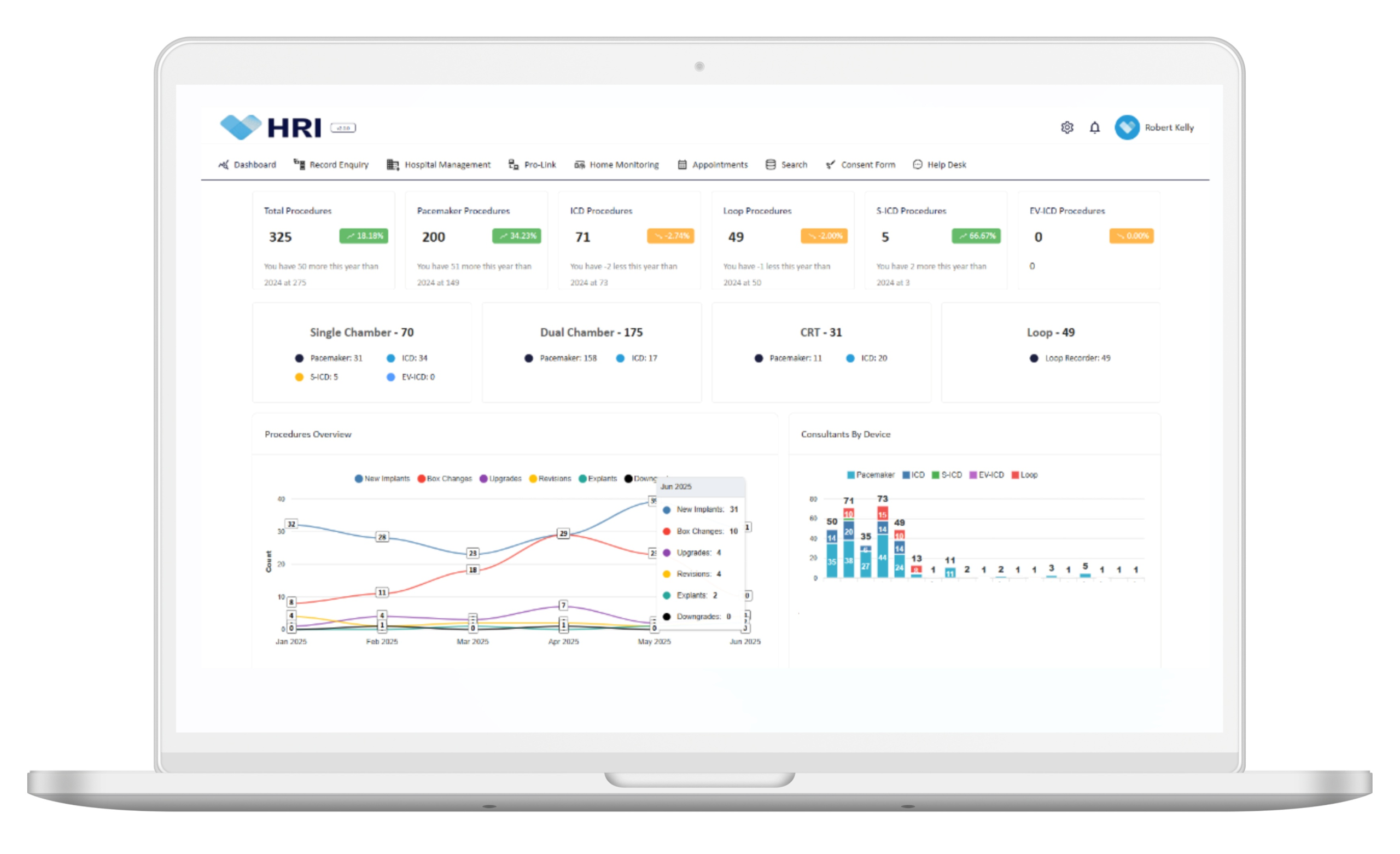 HRI’s secure cloud-based platform gives hospitals real-time access to critical cardiac device data from implant to follow-up. Automatically sync programmer reports, scan devices with barcode precision, and visualise trends instantly through custom dashboards.